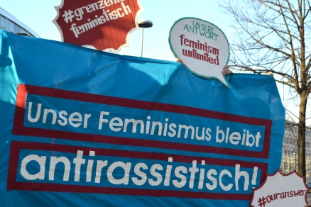 Wir verstehen uns als queerfeministische Gruppe gegen jeden Rassismus und Antisemitismus. Seit einigen Jahren liegt unser Schwerpunkt in der Beschäftigung mit Antifeminismus von Rechts. Seit 2014 sind wir Teil des What-the-fuck-Bündnisses und mobilisieren gegen christliche FundamentalistInnen. In der Vergangenheit haben wir zu verschiedenen Themen, wie rechten Angriffen auf körperliche Selbstbestimmung, Pränataldiagnostik und den Paragraphen §218/219, gearbeitet. 2016 haben wir die Plattform Feminism Unlimited ins Leben gerufen, die verschiedene (queer-)feministischen und antirassistische Zusammenhänge und Gruppen zusammenführt und Raum für gemeinsame Projekte, Austausch und Öffentlichkeit schafft. Im letzten Jahr haben wir Podien zu rechten Aneignungsstrategien feministischer Themen und zum Recht auf Abtreibung organisiert. Wir unterstützen und beteiligen uns am Frauen*-Streik am 8. März und haben anknüpfend an jedem 8. des Monats im vergangenen Jahr den Kontakt zu feministischen und frauenbewegten Stimmen im Osten gesucht. Hierzu haben wir uns mit Feminismus während der DDR und Wendezeit beschäftigt und trafen Frauen in Berlin und Brandenburg, die damals und zum Teil bis heute politisch aktiv waren und sind, um von ihren Erfahrungen zu lernen. Im Erzähl-Café-Format diskutierten wir über Solidarität, Antifeminismus, Care-Arbeit, Gleichberechtigung und Normalisierung rechter Strukturen in Politik und Gesellschaft in Zusammenhang mit den Veränderungen des politischen Systems. Aktuell beschäftigen wir uns mit der rechtlichen und gesellschaftlichen Diskriminierung von Sexarbeiter/*innen und der damit in Zusammenhang stehenden Thematik des Familismus. In Zusammenarbeit mit Selbstorganisierungen von Sexarbeiter/*innen wollen wir ihre Arbeitskämpfe kennenlernen und unterstützen.