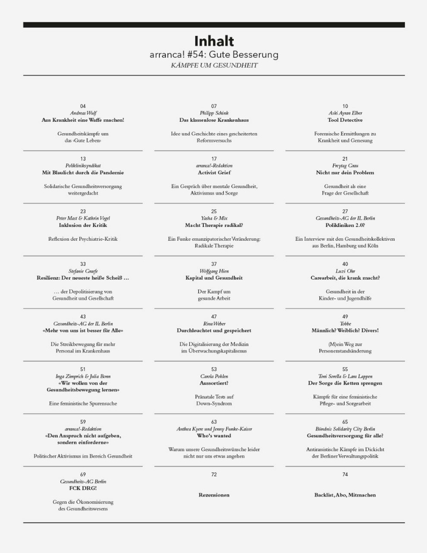 Artikel und Interviews von und mit Aktivist*innen der Gesundheitskollektive zeigen auf, wie eine bessere Gesundheitsversorgung konkret aussehen kann und warum soziale Lebensbedingungen nicht von individueller Gesundheit zu trennen sind. Andere Artikel, wie «Kapital und Gesundheit», eine Reflexion der Psychiatriekritik und «Carearbeit, die krank macht» in der Kinder- und Jugendhilfe nehmen Geschichte und Status Quo unter die Lupe. Schließlich widmen sich Artikel wie Resilienz als «neuester heißer Scheiß», «Digitalisiert und durchleuchtet» und «Aussortiert» den neuen Entwicklungen im Gesundheits- und Sozialsystem und deren Folgen.